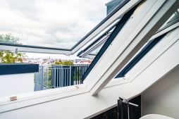 Další důležitou součástí energetické optimalizace se stala výklopně-kyvná střešní okna GREENVIEW preSelect MAX, která zaujmou trojsklem, vynikajícími tepelně izolačními hodnotami (Uw=1,0 W/m²K), zvýšenou bezpečností – vrstvené zasklení na vnitřní straně doplňuje tvrzené sklo na straně vnější.