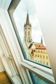 Okna v interiéru působí lehce, nechávají vyniknout pohledům na město a zároveň přispívají k vytvoření klidného a tepelně stabilního prostředí.